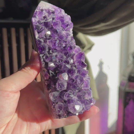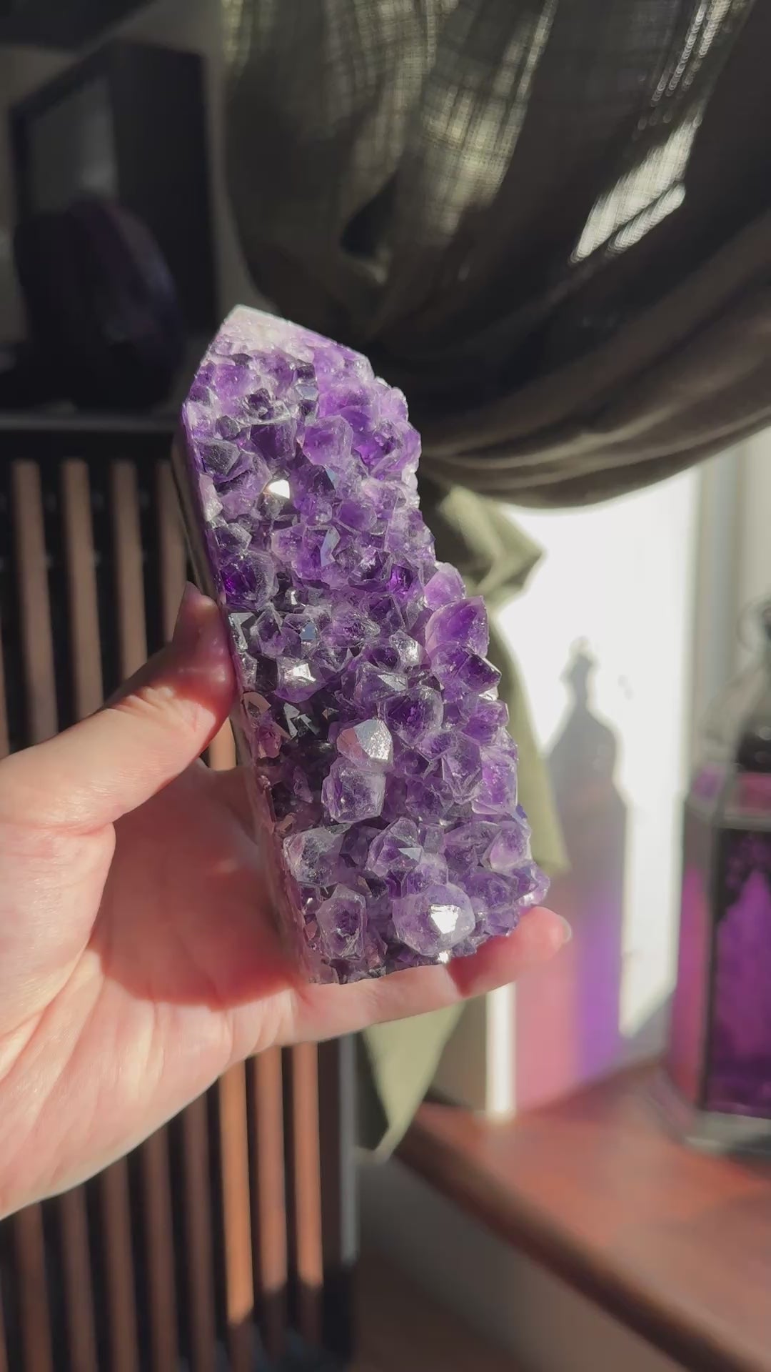 A gorgeous amethyst cluster tower with a green moss agate back. A little bloom at the top of the point, big clusters on the front and silver flash and rainbow all on the sides.