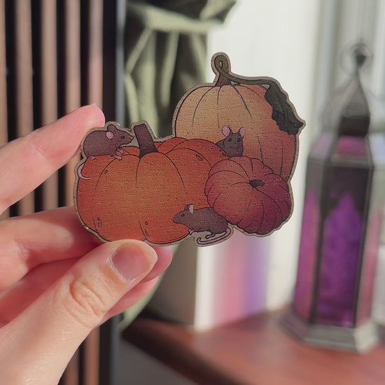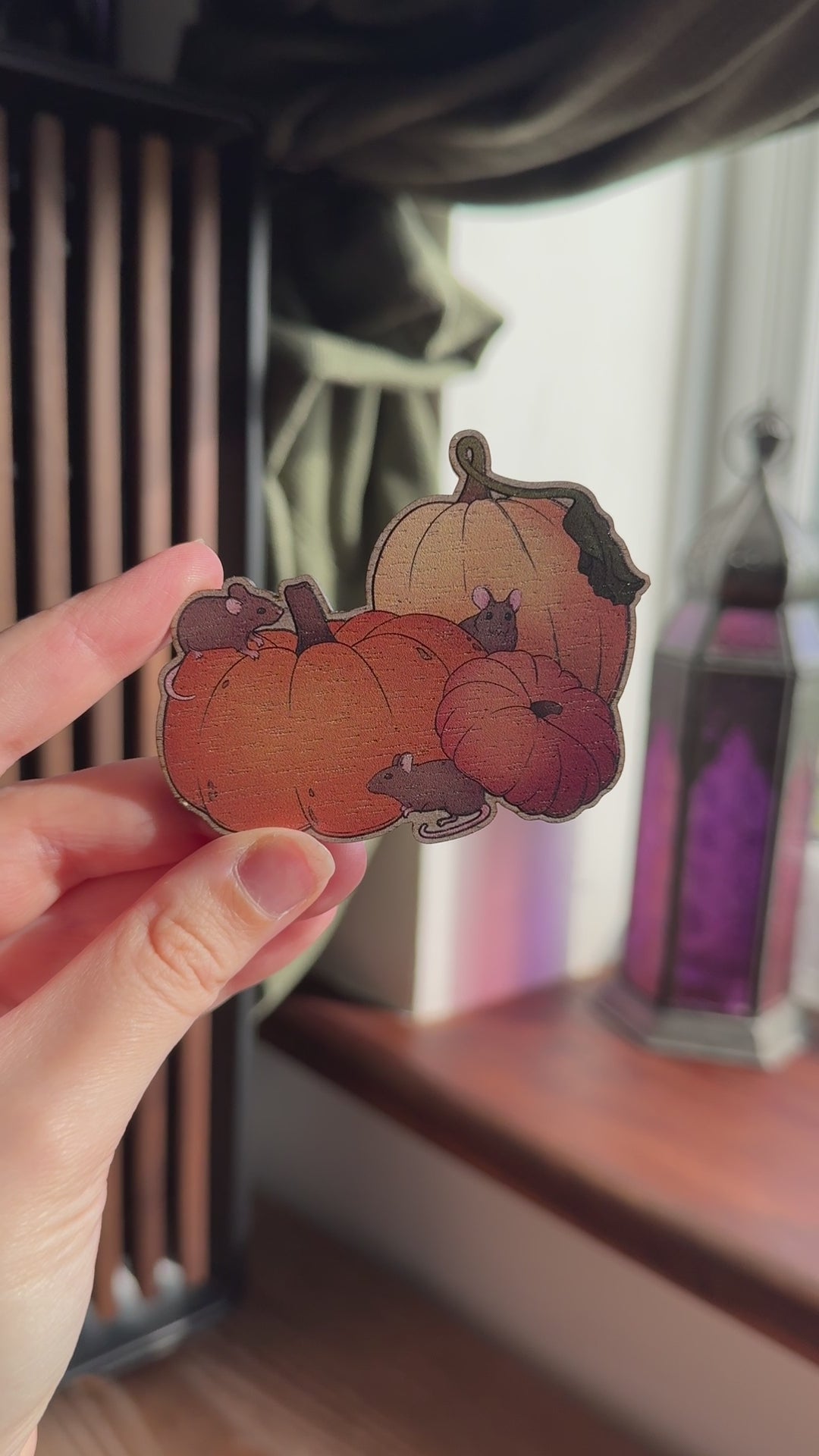 Inspired by the spooky autumn nights, when little critters come out to play. Featuring field mice amongst pumpkins.
