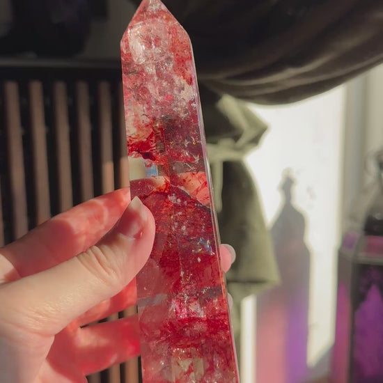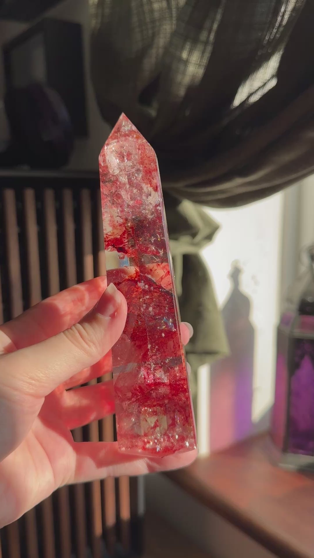 Stunning fire quartz tower with very vibrant reds in a clear quartz. With bold silver flash areas and rainbows thorough. My room was lit with rainbows while taking photos of this!