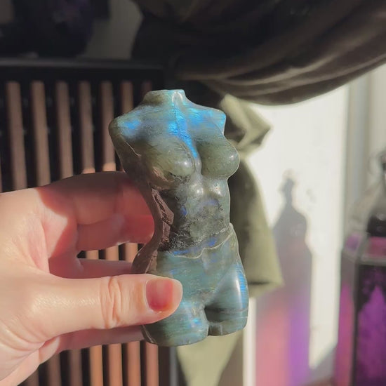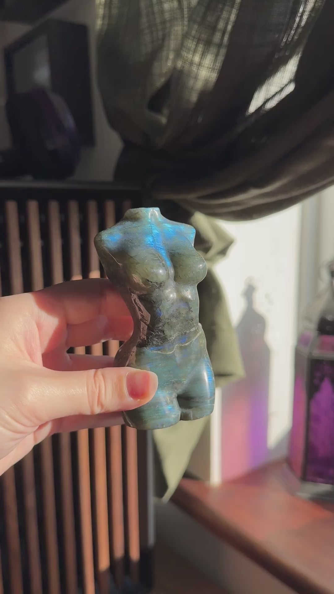 A very curvy female form made of labradorite. The blue flash forms stripe like patterns and silver flash speckles her body.