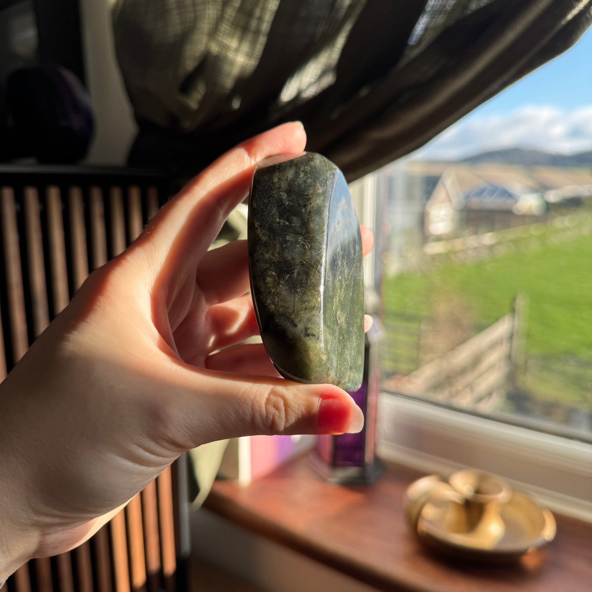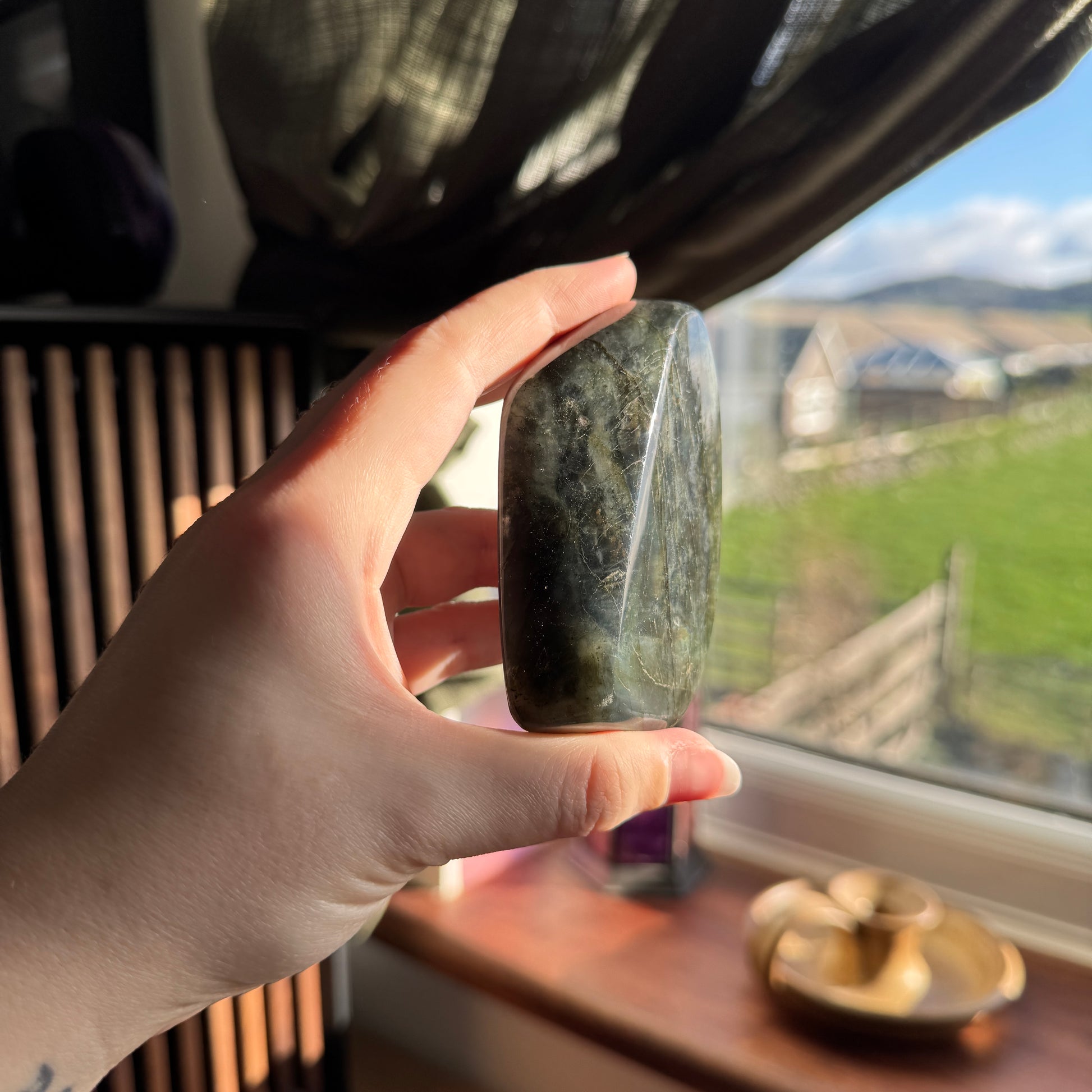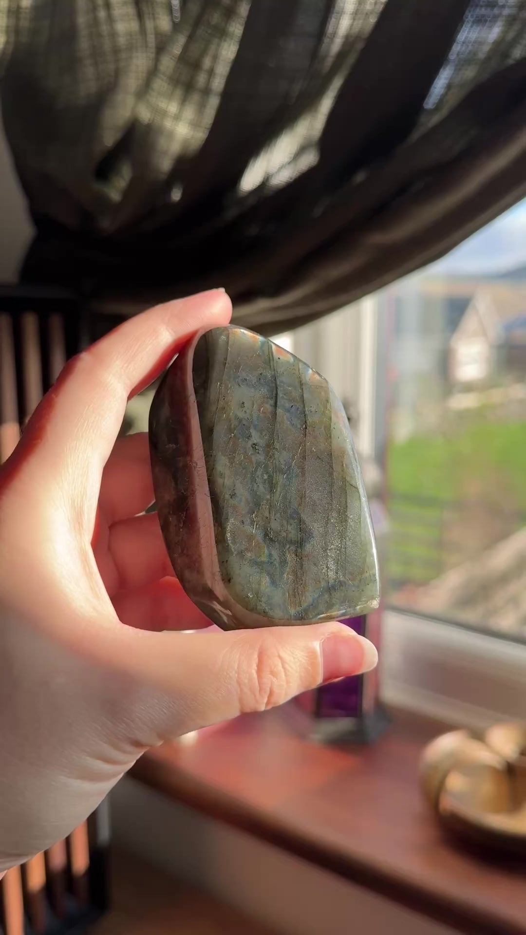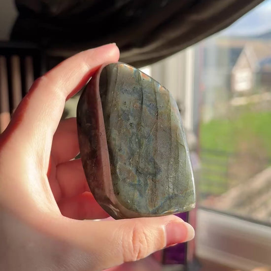 A pretty labradorite with patchy flash areas making it look like a map in a stone! With mostly gold and blue colours, there's also a bit of purple and green.