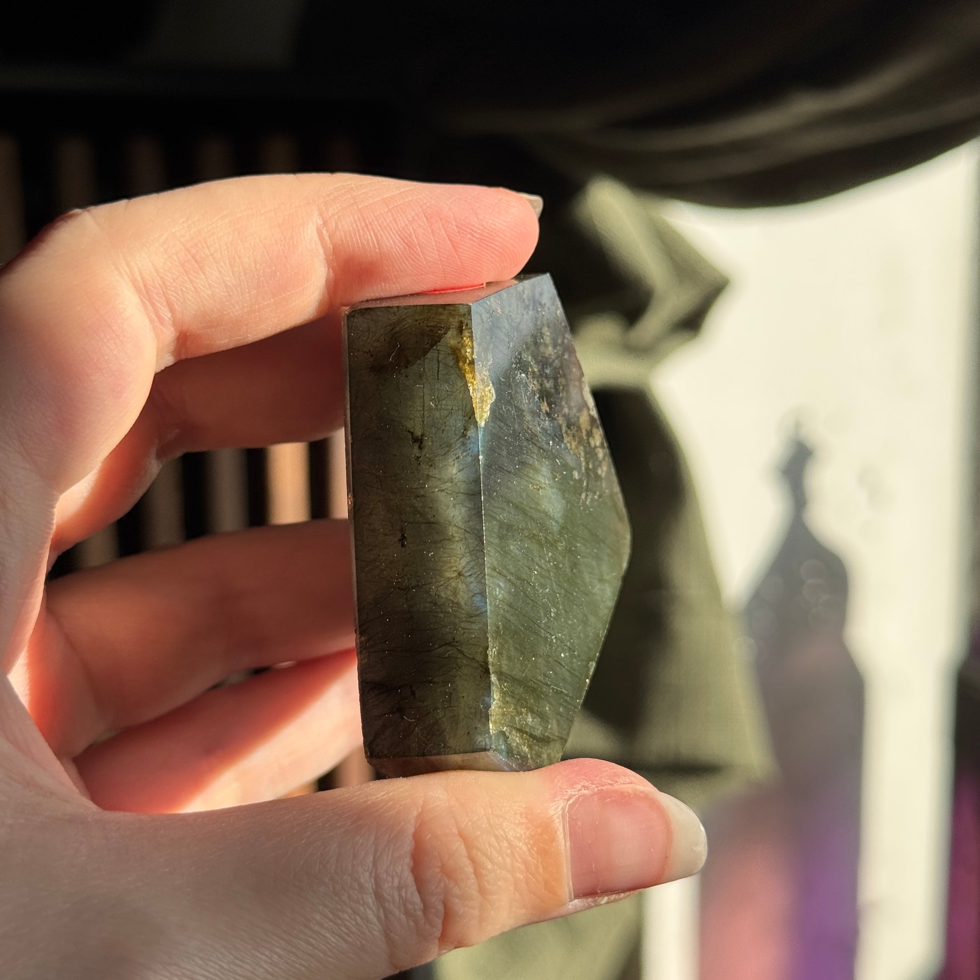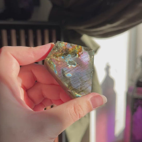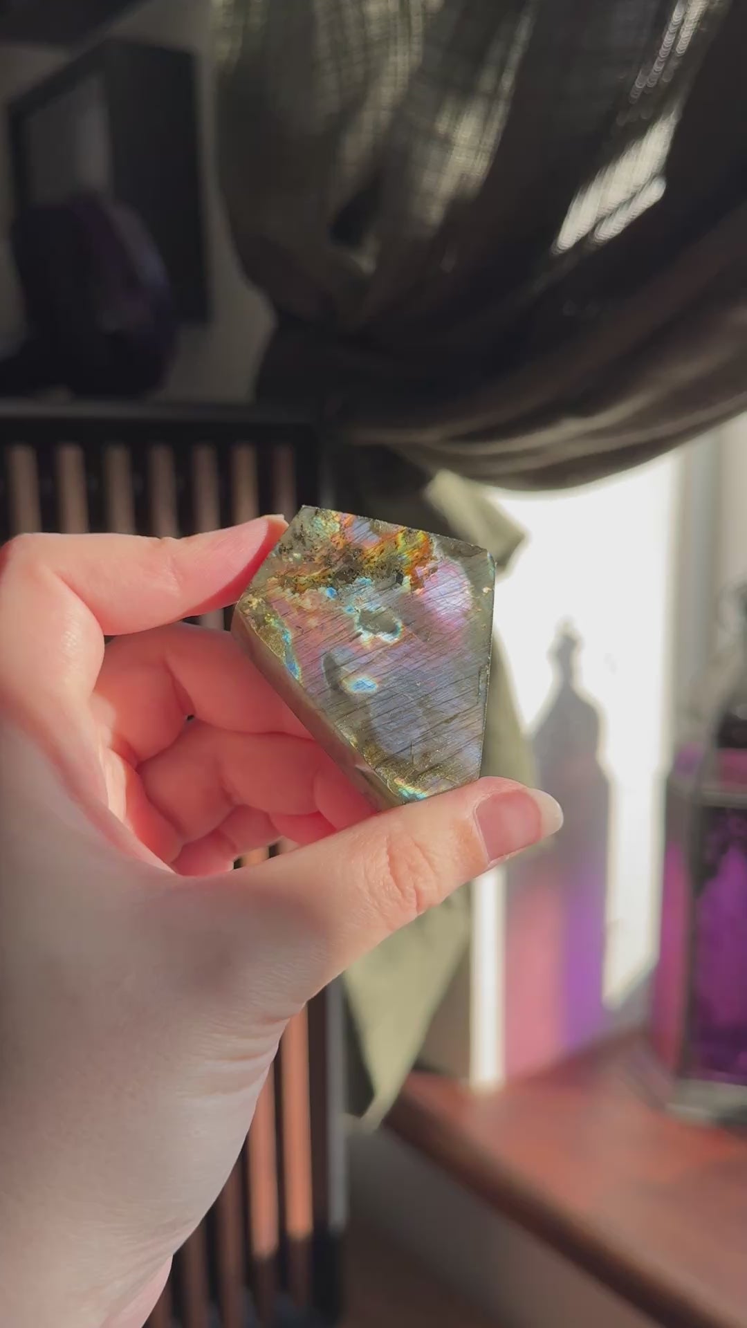 A little labradorite freeform with a big flash. This Little Rock is full of different colours making it look like a galaxy, along with speckled silver flash looking like little stars.